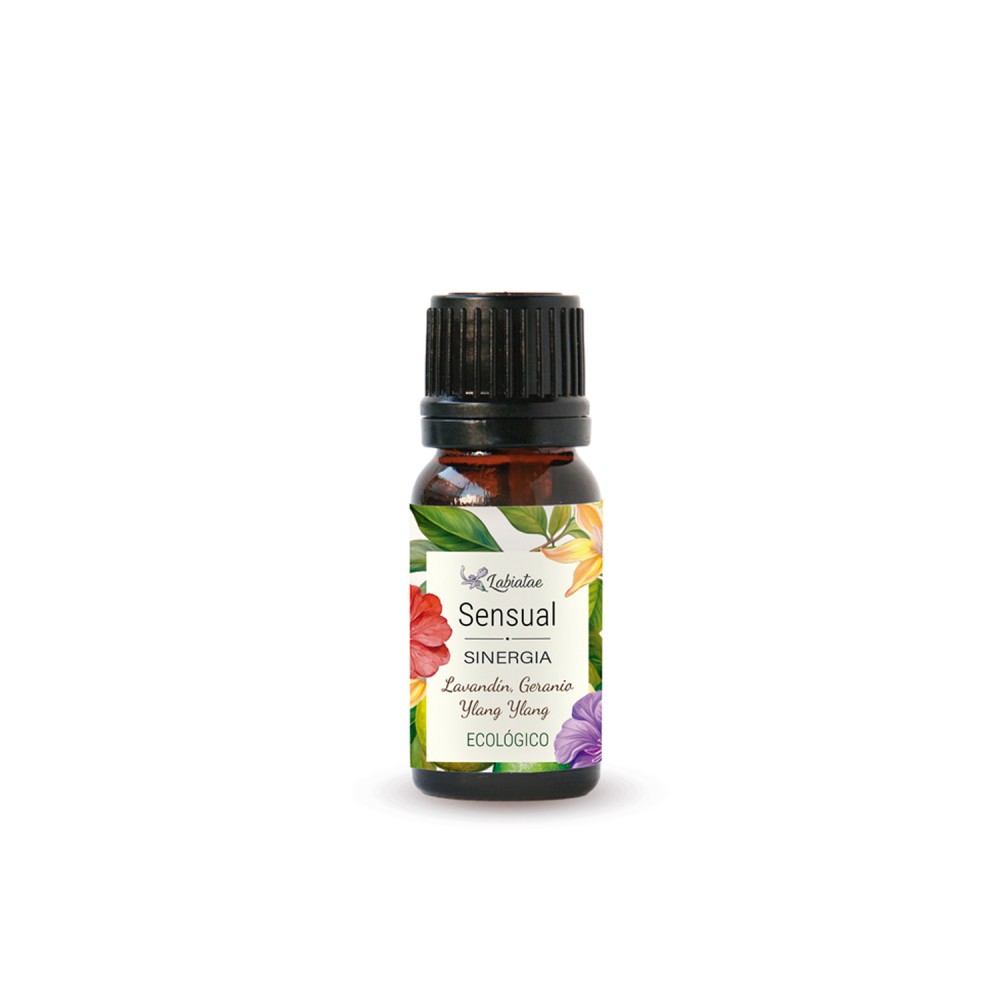 Mezcla de 3 aceites esenciales "Sensual", de Labiatae. Con propiedades afrodisiacas, relajantes y estimulantes. Para mezclar con aceite vegetal de primera presión en frío y aplicar en cara, cuerpo y cabello o añadir a un difusor proporcionando un aroma herbal y exótico. Envase de 12 ml.