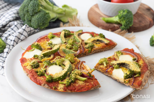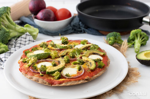 • Cortar la cebolla en rodajas finas e ir disponiendo por encima. Cortar también el brócoli en ramitas pequeñas y distribuir uniformemente. Hacer lo mismo con el aguacate cortado en gajos.