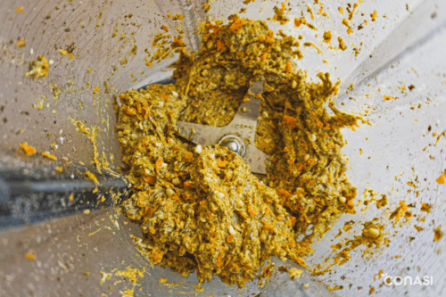 - Añadir la sal, el aceite, el agua y las especias. Seleccionar velocidad 5 y accionar el botón PULSO durante 8 – 10 veces, hasta que estén todos los ingredientes bien integrados.