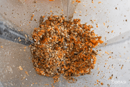 - Añadir las zanahorias y el trigo sarraceno escurrido, seleccionar velocidad 5 y accionar el botón PULSO durante 10 - 15 veces, hasta que las zanahorias y el sarraceno estén bien picados, con una textura granulosa. Integrar con una espátula los bordes.