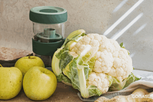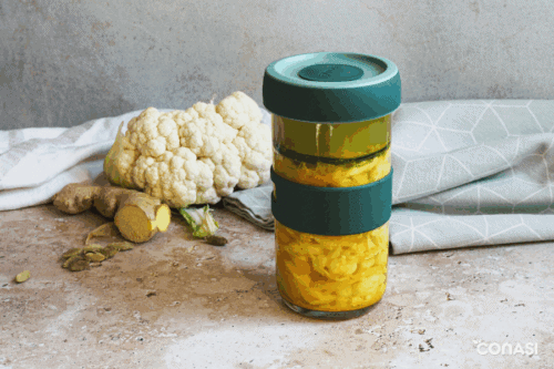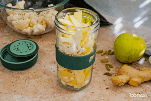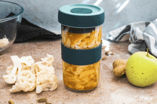 Fermentar coliflor nunca fue tan sorprendente como en esta receta. La combinación de jengibre fresco, cardamomo, manzana, cúrcuma y pimienta transforma un simple tarro de coliflor fermentada en un festín de aromas y matices exóticos. El resultado es un fermentado crujiente, ligeramente ácido, con un toque especiado y afrutado que despierta todos los sentidos. Además de su sabor único, esta preparación es un auténtico impulso para tu salud: aporta probióticos naturales que cuidan de tu microbiota intestinal, favorece la digestión y ayuda a reforzar tus defensas, potencia el valor nutricional de la coliflor y las especias. Para elaborar esta receta utilizaremos el tarro de fermentación Lékué, diseñado con válvula de silicona para dejar escapar el gas de manera segura y facilitar un proceso sin complicaciones. También puedes optar por otros sistemas de fermentación, como tarros de cerámica o tarros de vidrio con pesos para mantener las verduras bien sumergidas en la salmuera. Si te apasiona el mundo de los fermentados, en nuestro blog encontrarás muchas más recetas para seguir experimentando en tu cocina: desde el clásico chucrut, pasando por kimchi coreano, pepinillos fermentados o incluso un sorprendente queso feta de almendras. Atrévete a probar esta coliflor fermentada y descubre cómo un sencillo tarro puede abrirte las puertas a un universo de sabores vivos y nutritivos.
