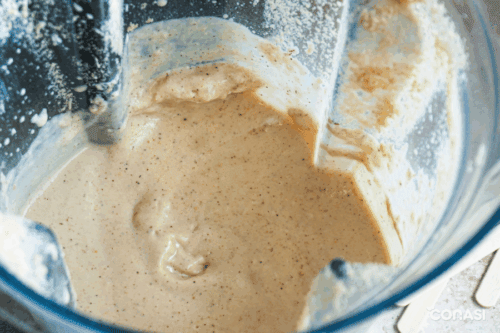 • Triturar las almendras en una batidora de vaso potente, estilo Vitamix, hasta que empiece a formarse un poco de apelmazamiento. El punto deseado es un punto medio entre almendras molidas y crema de almendras.