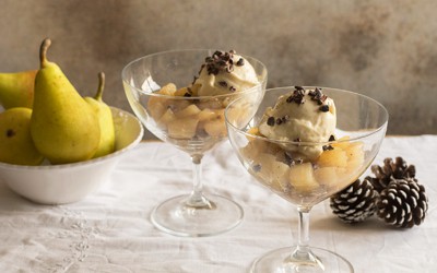 Copa de galletas, peras especiadas y helado de plátano – Menú navideño