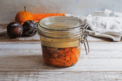 - Cerrar el tarro con su tapa y almacenar a temperatura ambiente durante varios días, alejado de la luz solar directa. Si es invierno, tardará una semana – diez días. Si es verano, revisar a partir del segundo o tercer día. En primavera u otoño, revisar a partir del cuarto o quinto día. Ir revisando durante la fermentación para asegurarnos de que la salmuera cubre la mezcla de verduras.