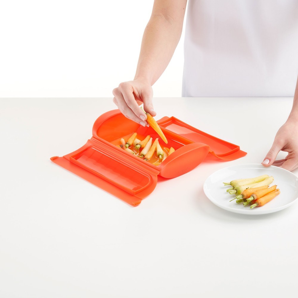 El estuche de vapor se puede utilizar muy fácilmente. Únicamente introducir los alimentos y cerrar las tapas. Ayudarte de las asas laterales para colocarlo en el microondas y retirarlo con ayuda de unos guantes térmicos. El tiempo puede variar según la receta y el tipo de ingredientes: