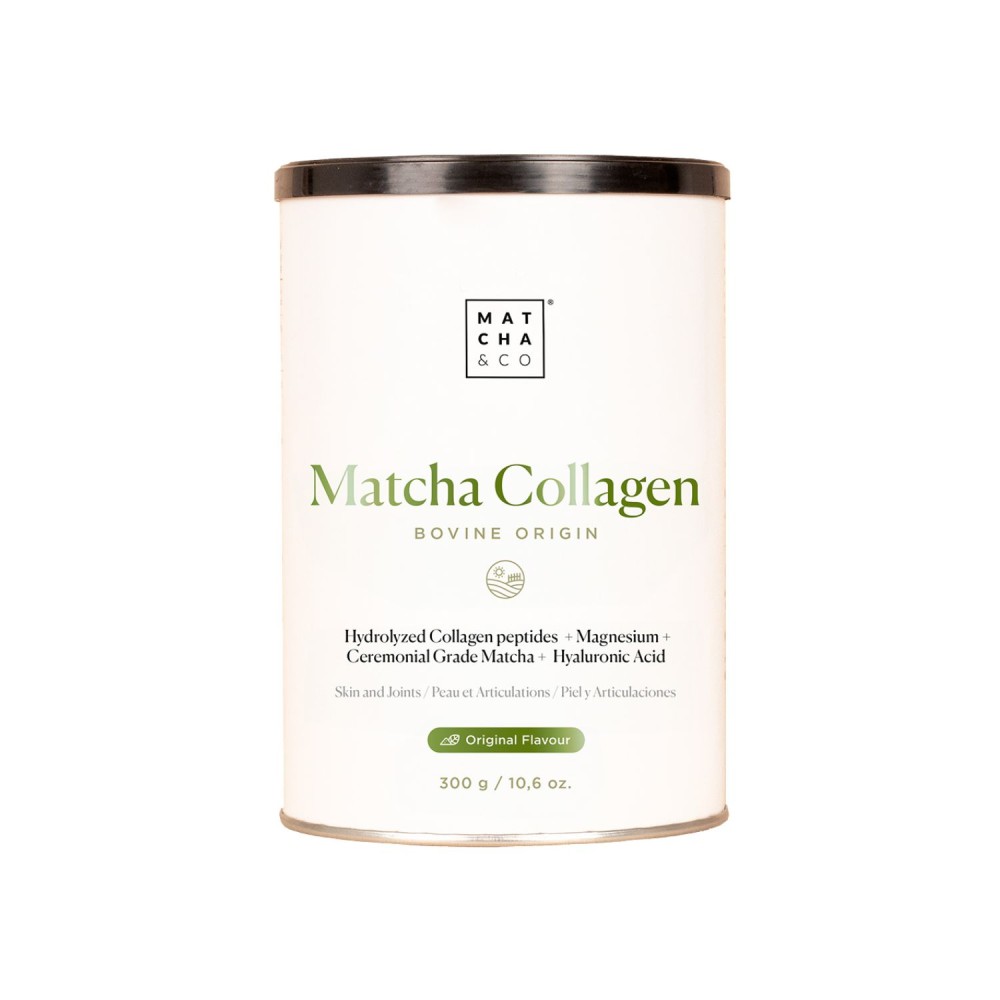 Colágeno hidrolizado bovino con té Matcha, de Matcha & Co. Complemento alimenticio en polvo que combina péptidos de colágeno hidrolizado (tipo I y III) con té matcha, magnesio y ácido hialurónico. Sin gluten, sin lactosa y sin azúcares añadidos. Sabor original. Envase de 300 g.