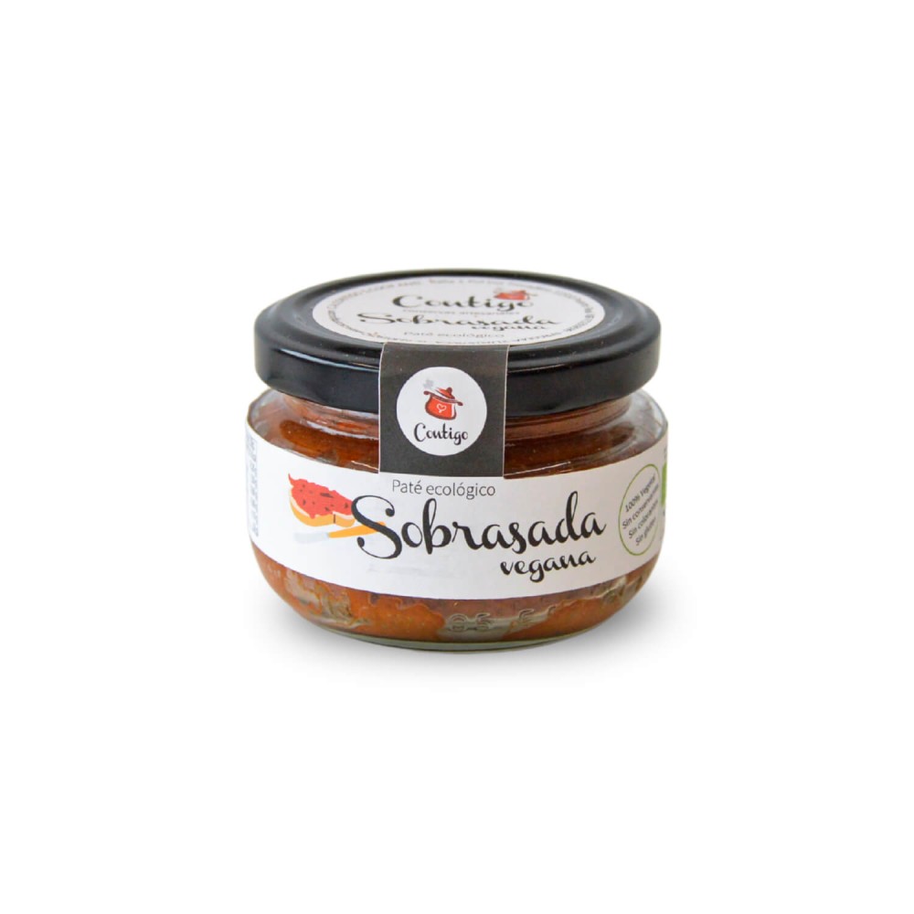 Sobrasada vegana ecológica, de Contigo. Es un paté vegetal elaborado a base de tomates secos, almendras y pimentón como alternativa al embutido tradicional, totalmente apto para veganos y vegetarianos. Sin colorantes ni conservantes. Ideal para combinar con panecillos, ensaladas, pizzas, focaccias, verduras asadas, rellenos de empanadillas, wraps, quesos veganos, etc. Envase de cristal de 120 g.