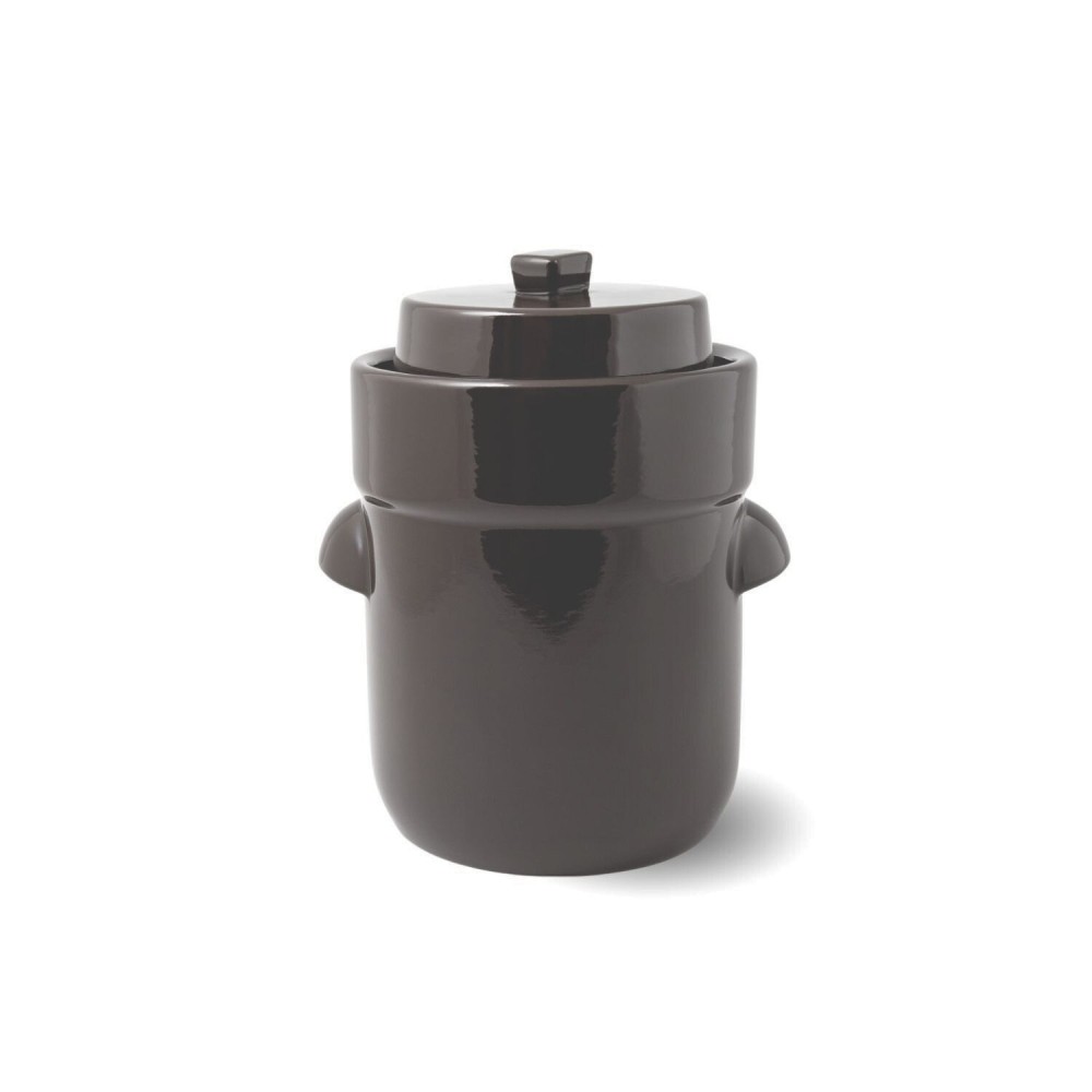 Bote o frasco de fermentación de cerámica de 3 l de capacidad, con dos piedras semicirculares. Tarro especialmente diseñado para permitir la salida de los gases de la fermentación e impedir la entrada de aire en el interior. Para fermentar en casa de manera segura y sencilla, para obtener alimentos fermentados como chucrut, kimchee y otros encurtidos o “pickles”.