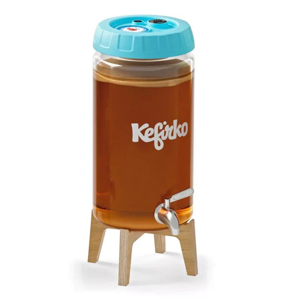 - Soporte de madera y grifo de acero inoxidable para poder rellenar los frascos herméticos para guardar el kombucha una vez fermentado.