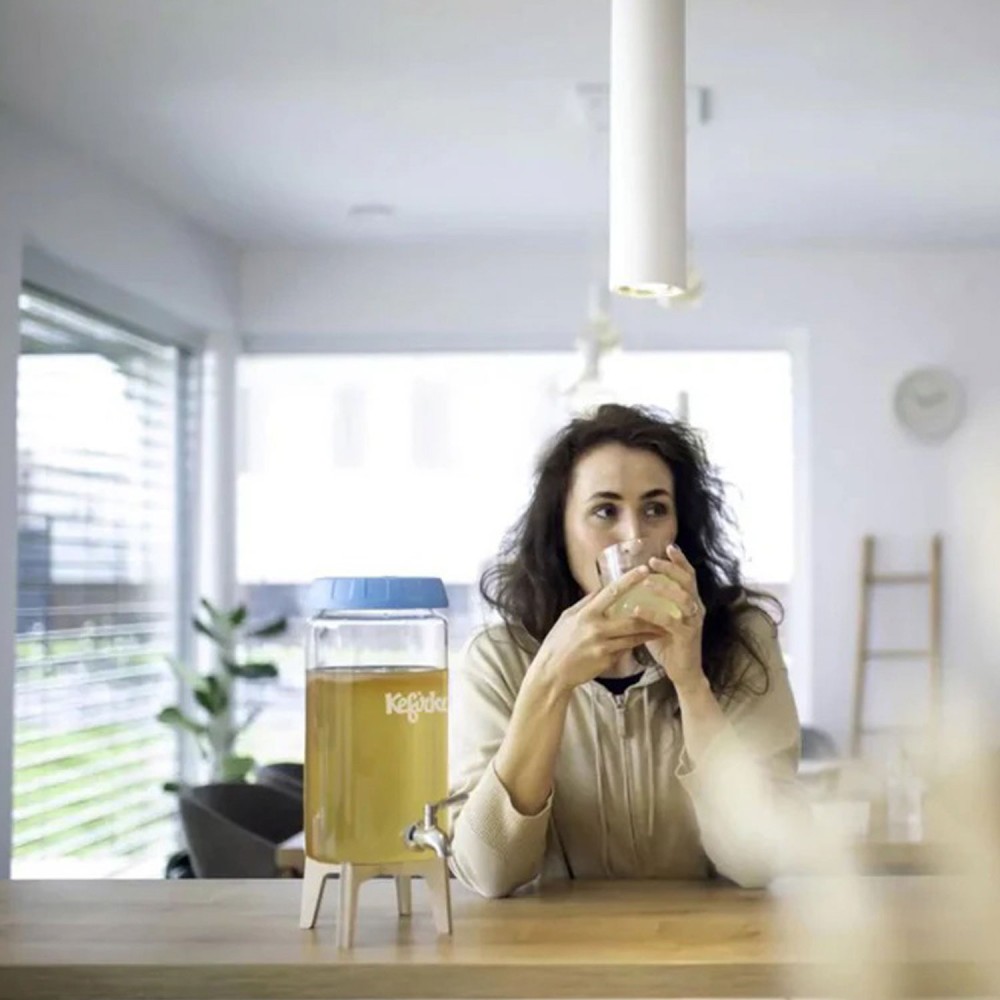 Kit para hacer kombucha, de Kefirko. Ideal para la elaboración de 4 litros de kombucha. Diseñado para poder fermentar en casa de forma fácil el té kombucha. Se trata de una bebida tónica apreciada por su alto contenido de vitaminas, sobre todo vitaminas del grupo B, por propiedades probióticas y porque facilita la digestión, entre otros beneficios para la salud intestinal y la salud en general.