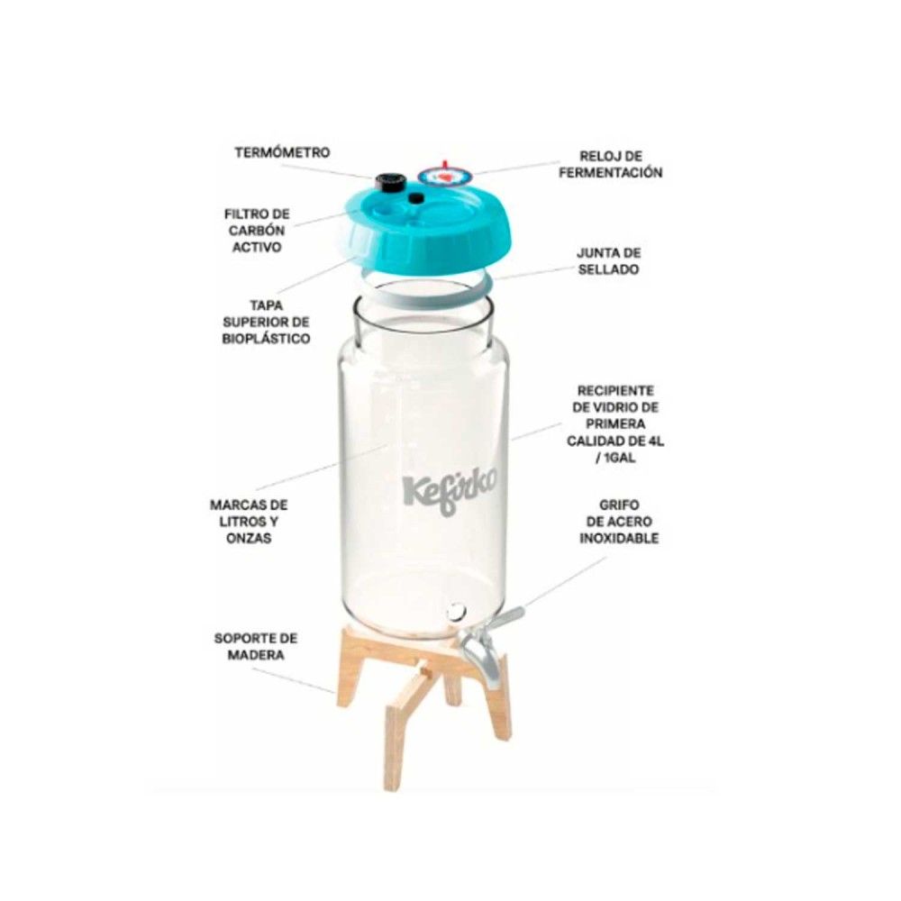 - Tarro de cristal, grifo de acero inoxidable, soporte de madera, tapa de bioplástico que incluye junta de sellado, termómetro, reloj y filtro de carbón activo, instrucciones.