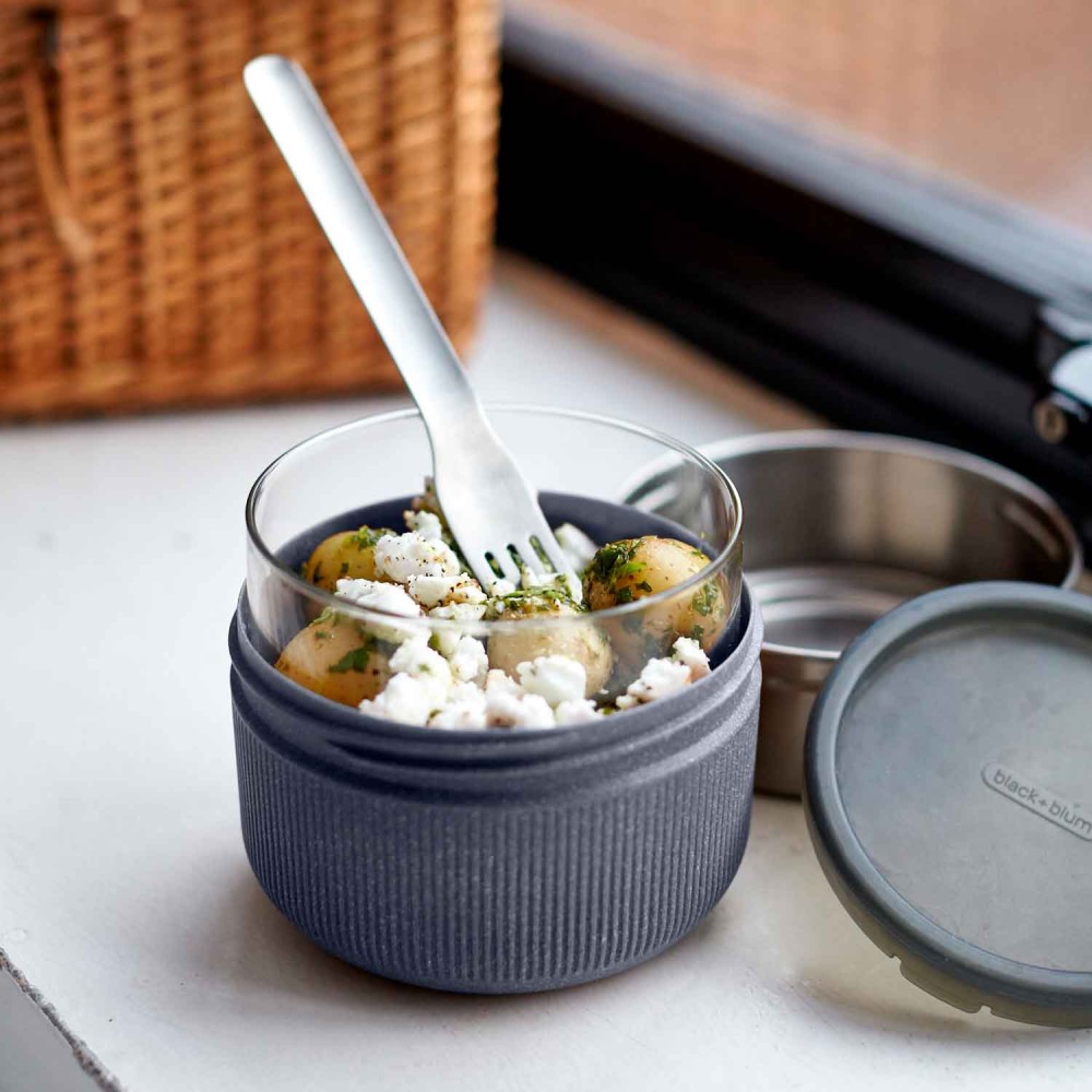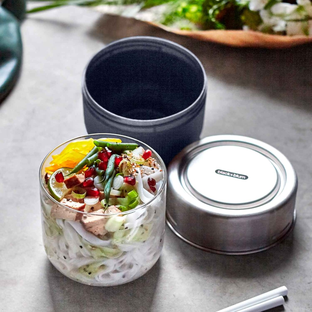 Fiambrera hermética de cristal con base protectora de fibra de madera y 2 tapas de 600 ml, de Black & Blum. Ideal para almacenar la comida, llevarla fuera de casa: en el trabajo, en excursiones al campo o la playa, etc., calentarla dentro del tarro y comerla.
