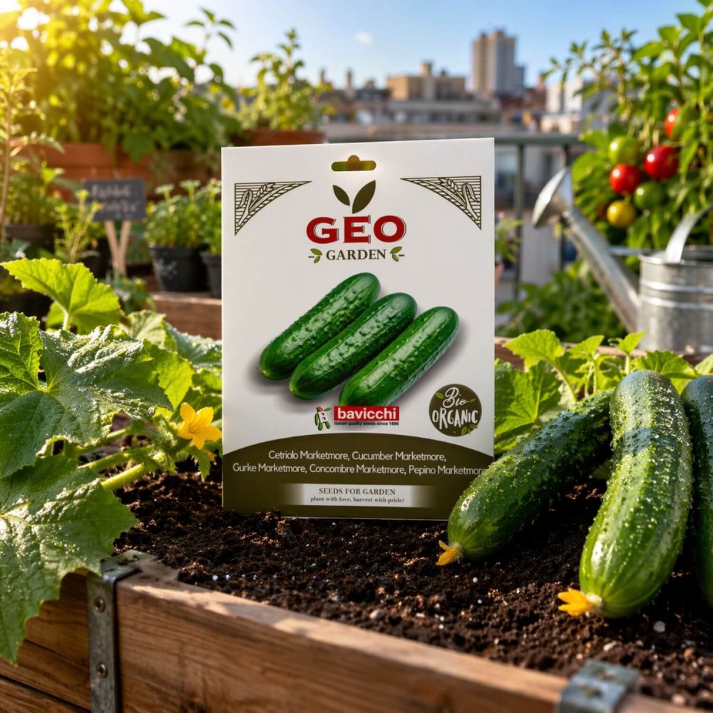 Semillas de pepino Marketmore, de Bavicchi GEO. Variedad clásica de fácil cultivo en interior o siembra directa, color verde oscuro, forma alargada y piel fina. Tiene sabor intenso, producción alta y prolongada, y no amarga. Envase de 2 g.