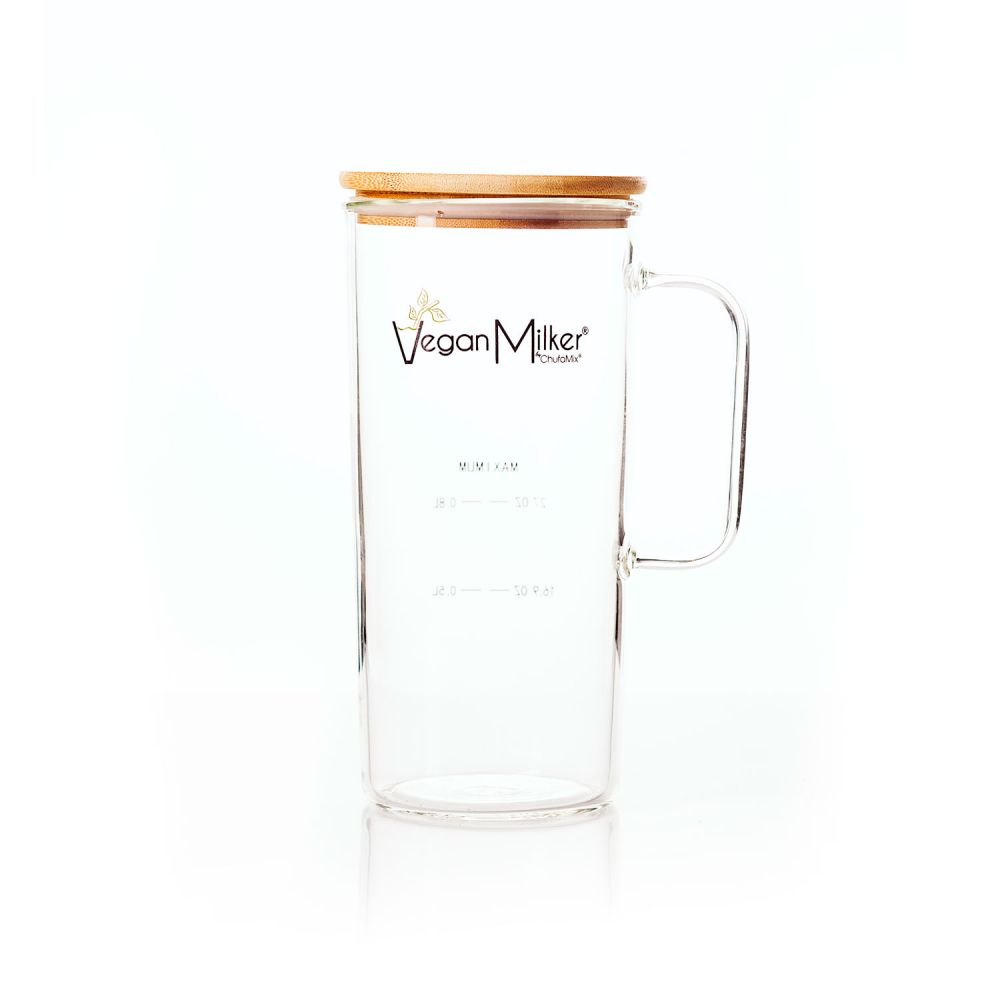 Vaso de cristal de VeganMilker con tapa de bambú, para almacenar las leches vegetales, cereales...
