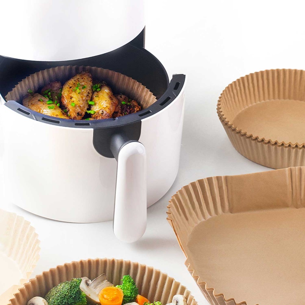 Moldes de un solo uso de papel de horno para freidora de aire, sin tóxicos. Papel de horno con certificado FSC, sin blanquear y sin parafinas. Paquete de 50 moldes redondos de 23 cm de diámetro.