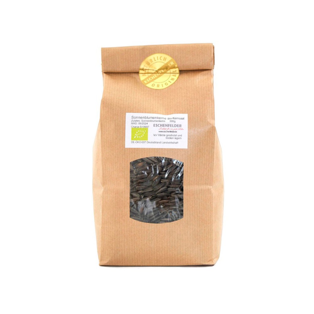Semillas ecológicas de girasol (Helianthus annuus) para germinar ecológicas, de Eschenfelder. Sus brotes tienen un sabor realmente delicioso y son muy fáciles de germinar. Envase de 500 g.